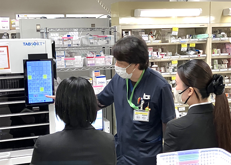 見学しながら、薬剤師業務や1日の流れをお話しています。