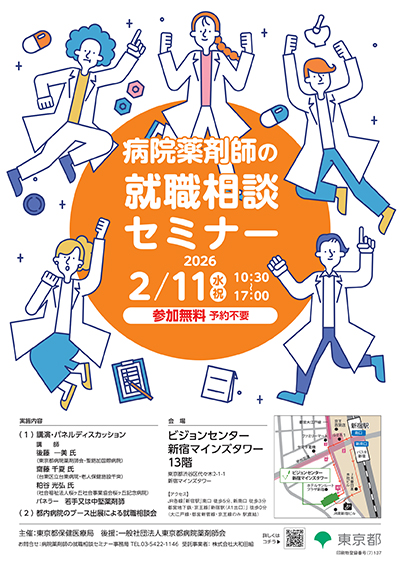 2026年2月11日(水・祝)に東京都庁の保健医療局が主催する「病院薬剤師の就職相談セミナー」への参加が決定しました。