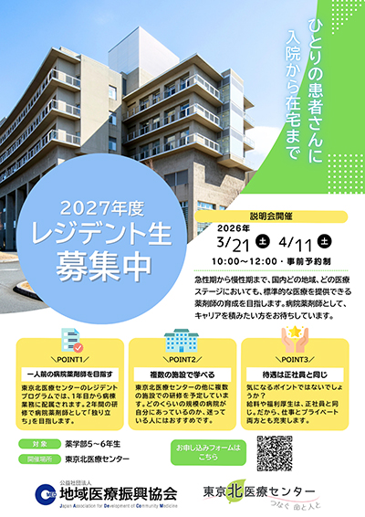 2026年3月21日(土)、4月11日(土)に東京北医療センター薬剤師レジデントプログラムの説明会の開催が決定しました。